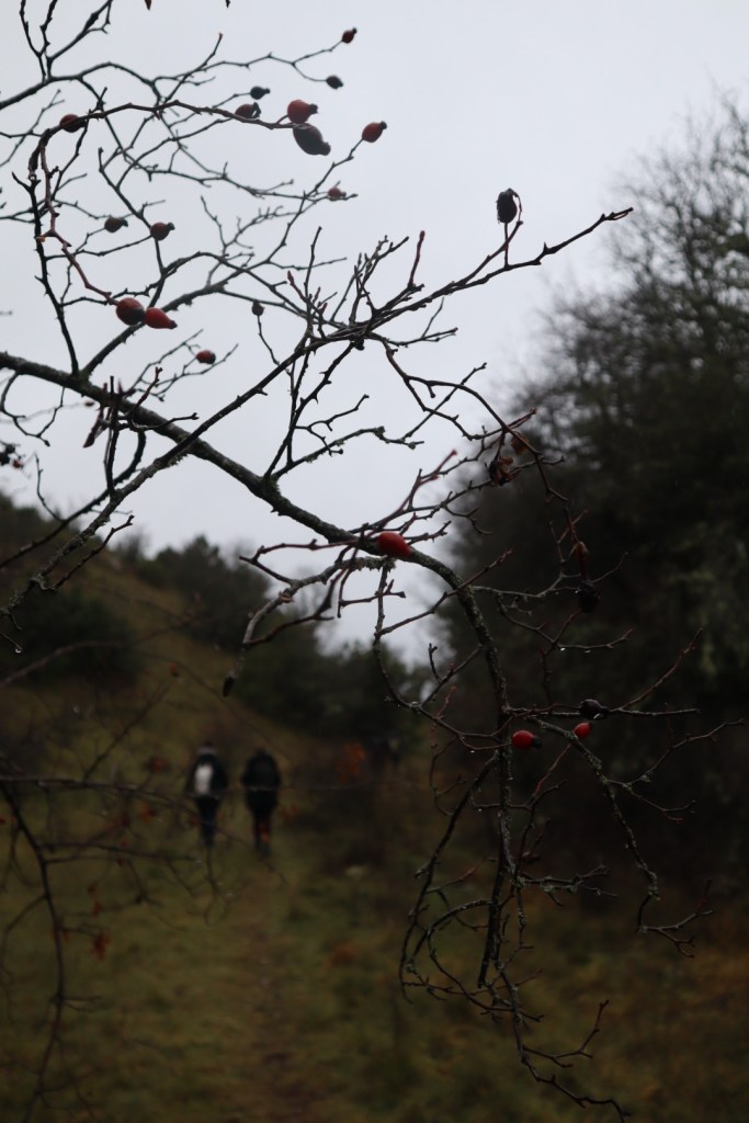 Καθώς περπατάμε, θα συναντήσουμε τις κόκκινες μικρές ρώγες της αγριοτριανταφυλλιάς – τα κυνόροδα. Πρόκειται για τον καρπό του φυτού Rosa canina, που ανθίζει την άνοιξη και τον φθινόπωρο χαρίζει αυτούς τους λαμπερούς καρπούς.