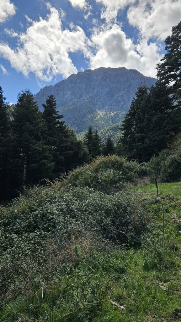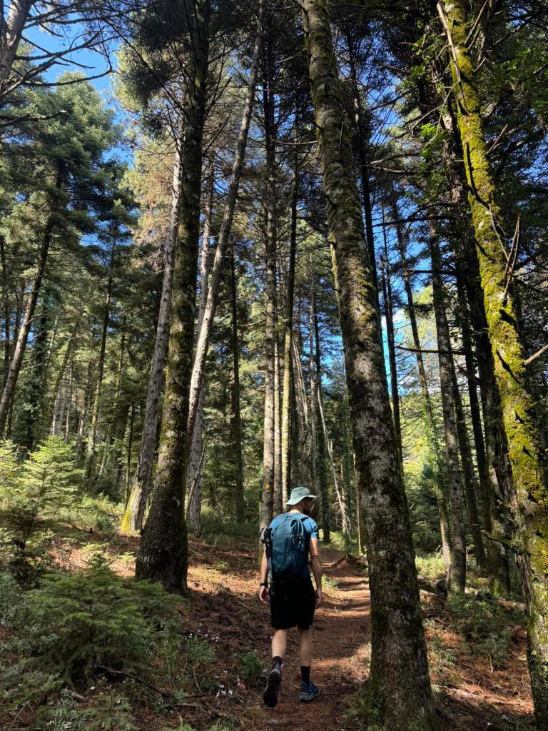 Η πεζοπορική μας διαδρομή κινείται σε μονοπάτια μέσα σε ελατοδάση, με ήπιο ρυθμό και συνεχή επαφή με το φυσικό περιβάλλον. Τα έλατα δημιουργούν σκιά, ησυχία και μια αίσθηση προστασίας, ενώ το έδαφος προσφέρεται για άνετο περπάτημα και συχνές στάσεις. Είναι μια διαδρομή που δεν πιέζει, αλλά αφήνει χώρο να απολαύσουμε τη φύση, να κουβεντιάσουμε και να κινηθούμε συνειδητά μέσα στο τοπίο.
