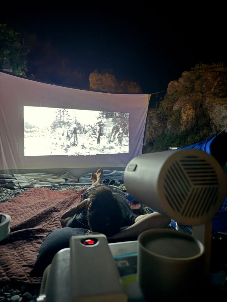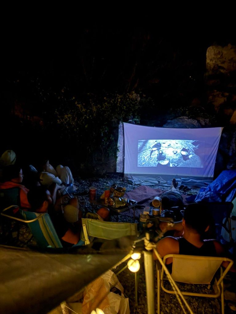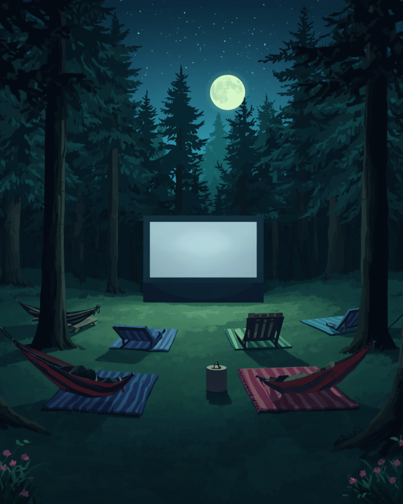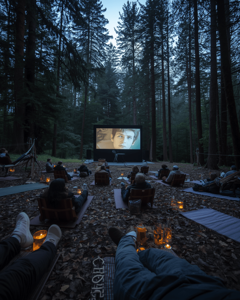 Φτάνοντας, στήνουμε το δικό μας “σινεμά” στη φύση. Ψάθες, σεντόνια, καρεκλίτσες παραλίας ή ακόμα και αιώρες ανάμεσα στα δέντρα — ο καθένας φτιάχνει το δικό του μικρό, άνετο spot. Γύρω μας το δάσος, από πάνω η πανσέληνος και μπροστά μας μια ιστορία που θα μας ταξιδέψει.